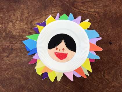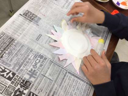 花びらのようにちぎった折り紙を紙皿の周りに、真ん中に笑顔のイラストを貼り付けました。これから、卒業・入学の飾りとして大活躍しそうです。