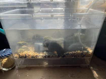 ザリガニの水槽をきれいにしていました。