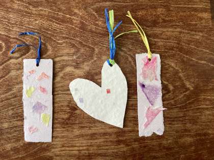 穴を空けて、紐を通し、他の色の和紙を飾ってステキなしおりができました。