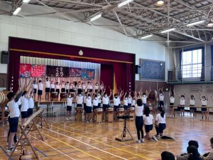 6年生からばちを引き継ぎ、山崎太鼓の伝統は32代目に引き継がれました。