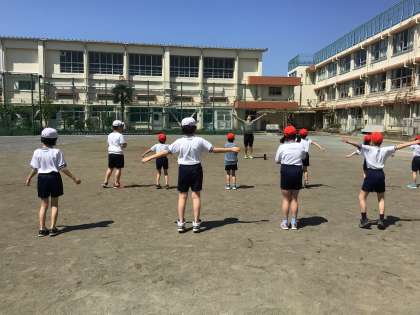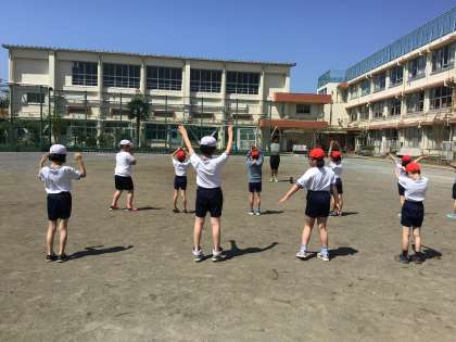 今日も青空の下、元気にラジオ体操をしました!みんな、並び方が上手です!