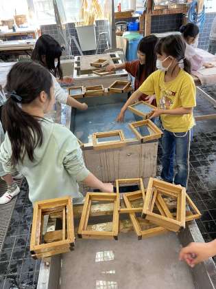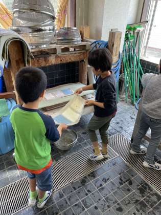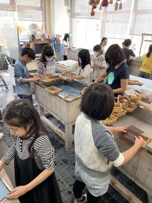 今日は3年生が19人、1人3枚ハガキを漉きました。