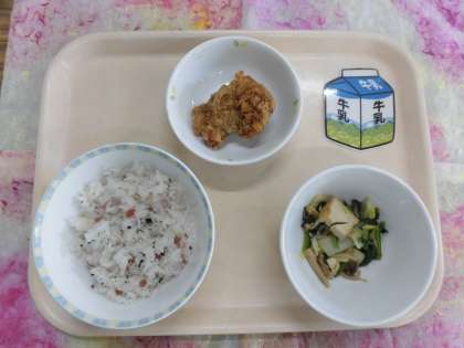 明日はいよいよ、スポーツ祭り「春」です。一生懸命、校庭で練習している子どもたちに給食室からは「鶏肉のからあげ」で応援です。しっかり食べて明日は精一杯がんばってください。暑いので水分補給も忘れずにしましょう。