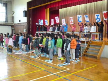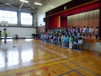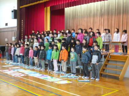 曲目は、合唱「歌よ ありがとう」、6年生を送る会の出し物として練習している呼びかけと合唱「歌え バンバン」での替え歌、鍵盤ハーモニカ「ぷっかり くじら」、合奏「アイ アイ」の4曲を発表しました。