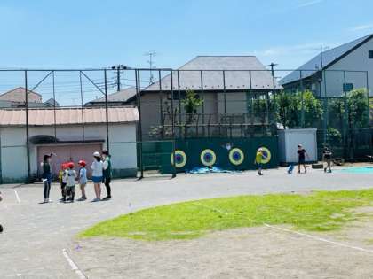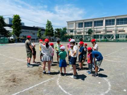 鬼ごっこメンバーとボール遊びメンバーに分かれて、ルール説明しています。