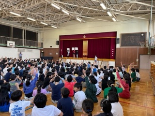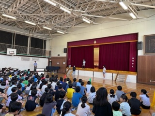 ステージの幕の間を通る物が何かを当てる集会でした!