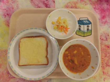 今日は暑い日に食べたら元気が出そうな「にんにく」を使った「ガーリックトースト」です。これから夏にむけて旬をむかえる「トマト」も登場です。たくさん食べて少しずつ暑さになれていきましょう。