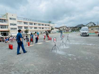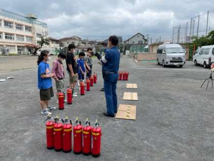 6年生だけ残り、消防署の方から「初期消火」について教えていただき、全員体験しました。
