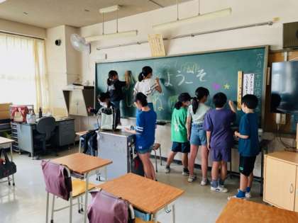 6-1、転入生に向けて黒板にメッセージ書いていました。