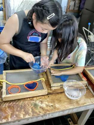 紐を使って形を作り、そこに染色楮を流し込んで造形作品を作りました。