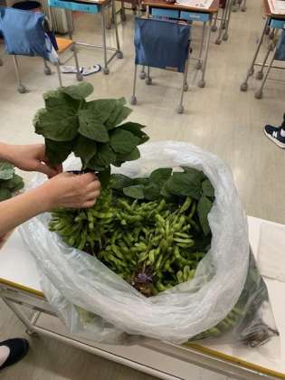 1時間目は、仲よし学級さんで食育授業。枝豆の皮むきを体験しました。