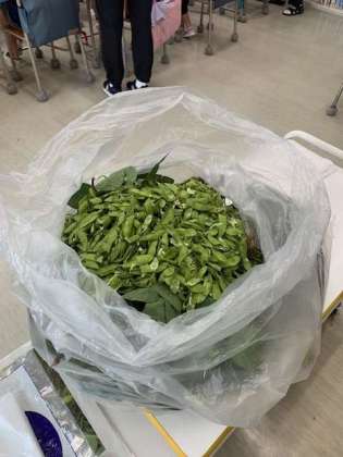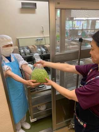 みんなの頑張ってむいた「緑のダイヤモンド」は、栄養士さんから調理員さんに手渡されました。