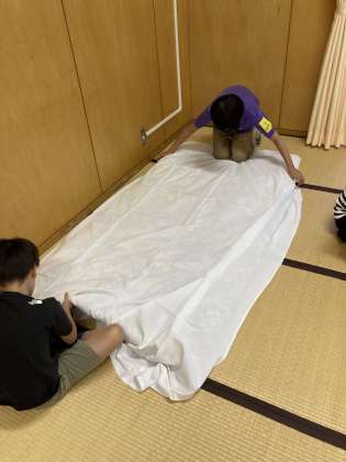 河口湖を経験している5、6年生が、シーツのかけ方をしっかりと教えてくれました。