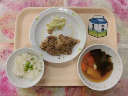 今日は保健給食委員会で考えた「食品ロスへらそう献立〜第3弾〜」です。旬の枝豆をのせたごはんを、しょうが焼きやおみそ汁と一緒に食べます。今回、保健給食委員会では和食の献立作りに挑戦しました。みんな一生懸命に考えたものばかりなので残さず食べてくれたらうれしいです。