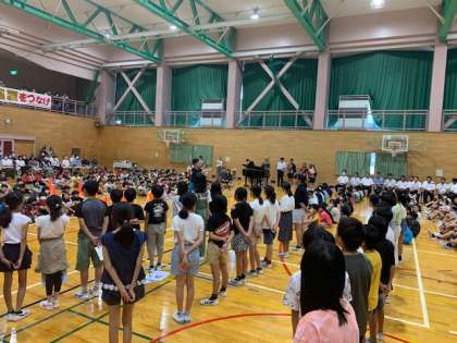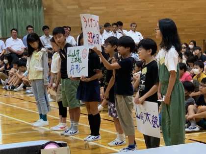 3校の校歌をお互いに披露し、山崎小学校の紹介もしました。