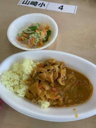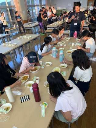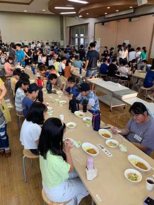 夕飯は舟形小学校のランチルームに全員揃ってカレーライス