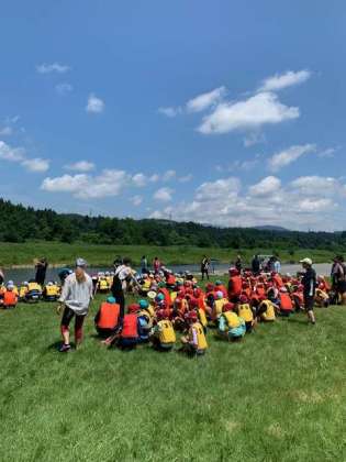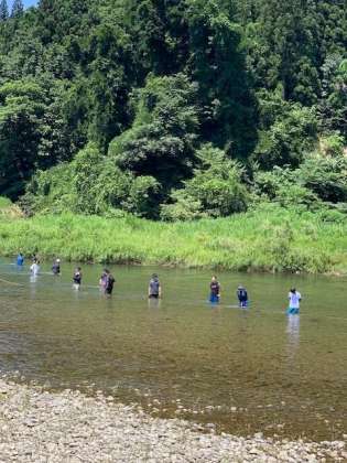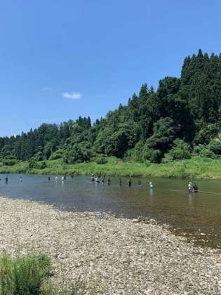 川の中で流れが早いところ、深いところを避けるために、ロープを張り、大人がズラリと並びます。