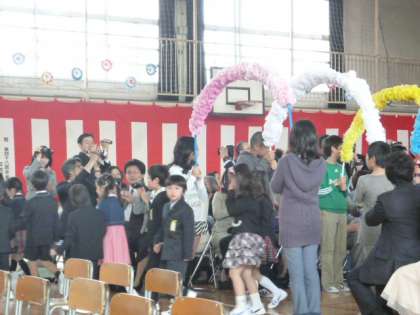来賓・保護者の皆様、教職員が見守る中、56名の新入生が6年生が持つアーチを通って元気に入場しました。