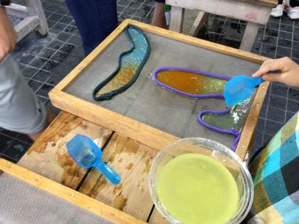 展覧会に向けて、久しぶりに紙すきに取り組みました。カラーロープで形を作り、紙の水を流して乾かすと、綺麗な飾りができます。みんなの作品を繋げて、展示する予定です。