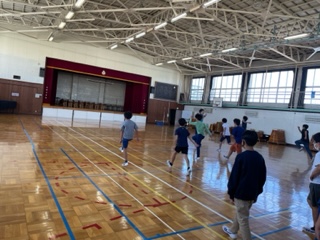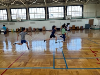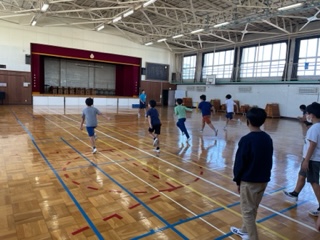 現在体つくり週間の取組として、中休みに希望者が集まって体育館で走る練習をしています。