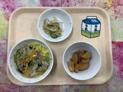 今日は秋の味覚「さつまいも」を揚げて、シナモン風味に味付けしました。ポテトと聞いて「じゃがいも」を想像する子もいるようなので、給食を見て驚くかもしれません。食欲の秋にふさわしく、たくさん美味しい食べものと出会ってくれたらうれしいです。