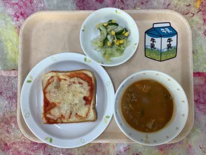 今日はパンの献立です。パンの日は、給食当番が上手に配膳している様子がクラスのあちらこちらで見られます。残りがちな牛乳もパンと一緒に飲んでくれたらうれしいです。