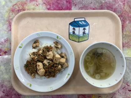 今日は麻婆豆腐をごはんにのせて食べる「麻婆豆腐丼」です。丼ものは、いつもたくさん食べてくれるので、今日も残さず食べてくれたらうれしいです。麻婆豆腐を焼きそばにのせて食べる献立もありますが、みなさんはどちらが食べやすいでしょうか。