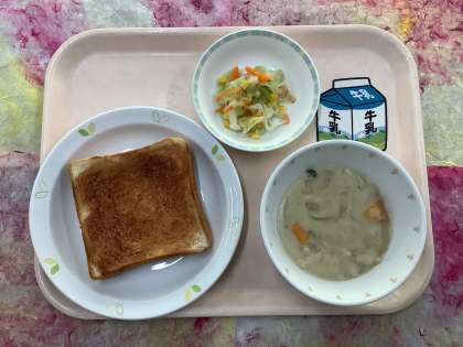 今日は洋食献立です。スパイスの王様と呼ばれる「シナモン」に、バターやお砂糖を混ぜたものを食パンに塗ってトーストしました。しっかり食べてインフルエンザに負けないよう過ごしましょう。