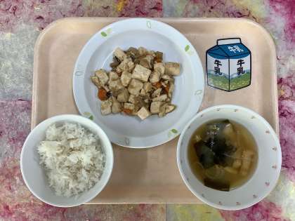 今日はお豆腐を使った献立です。白いごはんがすすむ味付けになりました。あるクラスで、ホワイトボードに完食した日を書いているのですが、最近、急増していて嬉しいです。授業で勉強して実行に移しているそうですが、その行動力はさすがです。