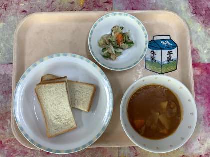 今日はパンが主食の献立です。給食室で食パン1枚1枚にいちごジャムを塗って半分にカットしました。みんなが美味しく食べてくれることを願って作りました。「食品ロス削減月間」もあと少しですが、残さず食べましょう。