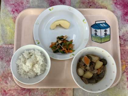 今日は、白いごはんに煮物やおひたしといった和食献立です。今月は【和ごはん月間】です。健康的な和食の良さを知ってくれたら嬉しいです。これから冬に向けて旬を迎えるりんごも、みんなが元気に過ごせる栄養がつまっています。しっかり食べて楽しい3連休を迎えましょう。