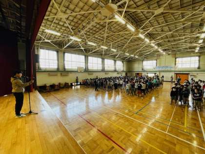 体育館での全校朝会でした。