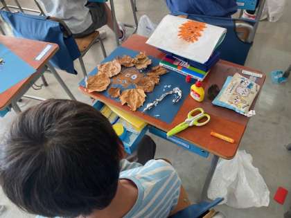 そこで拾ったたくさんの落ち葉や、どんぐりを使って、絵を描きました!