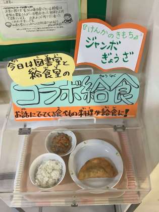 今日は図書旬間第4弾です。毎年、6年生からのリクエスト給食でも上位にランクインする「ジャンボぎょうざ」が図書室の本とコラボしています。図書「けんかのきもち」に登場する「ぎょうざ」。本を読んでから食べるもよし、食べてから本を読むもよし、どんなお話なのか考えながら食べると楽しいかもしれません。