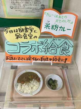 今日は図書旬間第5弾です。図書「カレーはあとのおたのしみ」から「米粉カレー」を食べます。お店でカレーを頼んだら、違う料理が出てきてなかなかカレーが出てきません。それにはどうやら理由があるようです。さて、いったいどんな理由なのでしょうか。ぜひ本を読んでみてください。図書コラボ給食は本日が最終日ですが、図書旬間は明日まで続きます。