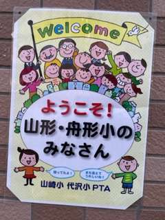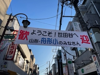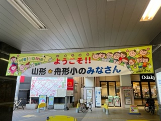 梅ヶ丘駅から山崎小に向かうまでの間、商店街には舟形小の皆さんへのお迎えのメッセージでいっぱいになっています。