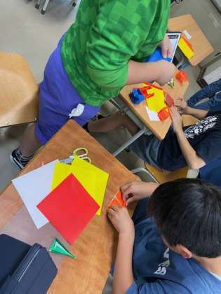 舟形交流に向けて、装飾をつくっている様子です。東京の魅力を伝えようと、東京タワーを制作中!三年生の廊下掲示には、東京タワーがたくさん登場しています。