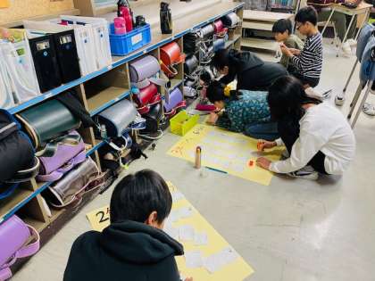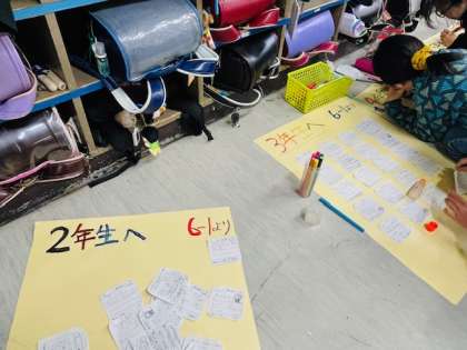 他の学年に向けて書いたメッセージを、それぞれの学年に向けて模造紙に貼っています。