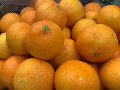 くだものの「紅まどんな」は今が美味しい旬を迎える愛媛県産の柑橘です。朝、「紅まどんな」ってなあに?と聞きに来てくれた子どもたちがいました。どうやら、さつまいもかと思ったようですが、それは「紅あずま」ですね。