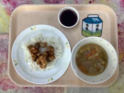 今日は「しいら」という普段あまり目にすることがないお魚が登場です。お魚を油で揚げて甘辛ダレをからめ、ごはんに乗せて食べます。めった汁は石川県の郷土料理で豚汁のようなものですが、ジャガイモではなくサツマイモが入っています。
