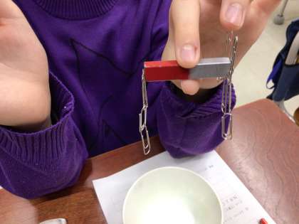机の脚、黒板、スチール棚など、磁石は鉄につくことを学んだ後で、磁石が鉄を引きつける力は、どこが強いか調べました。