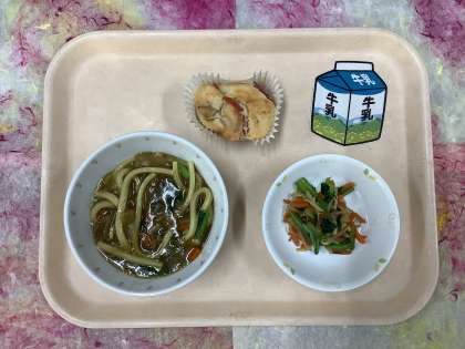 今日はしっかりとろみのついたカレーうどんです。できるだけ冷めないようにとろみを増量してみました。りんごのケーキも、シロップで煮た甘いりんごがゴロゴロ入っていて美味しく焼き上がりました。2学期の給食も今週で終わります。美味しく食べてくれるよう給食室も頑張っているので、みなさんも残さず食べてくださいね。