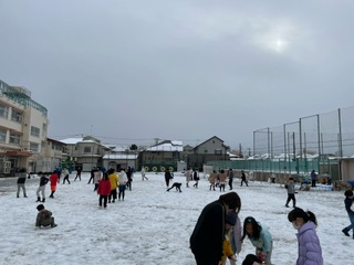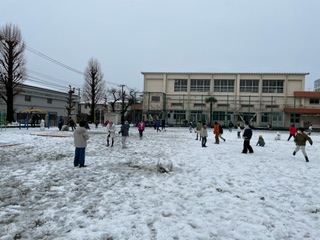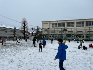 2月6日、1年生と一緒になって、校庭で雪遊びです!