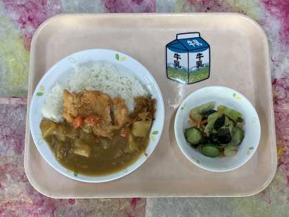今日はいつもの米粉カレーに「チキンカツ」がついています。インフルエンザが流行っていてお休みの児童が増えています。インフルエンザに「勝つ!」ためにしっかり食べて元気に過ごしましょう。手洗いも忘れずにしましょう。