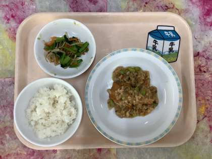 今日は生揚げにあんかけをかけて食べる和食の献立です。ごはんや牛乳も残さずしっかり食べましょう。インフルエンザが本格的に流行っています。手洗いをしっかりしましょう。