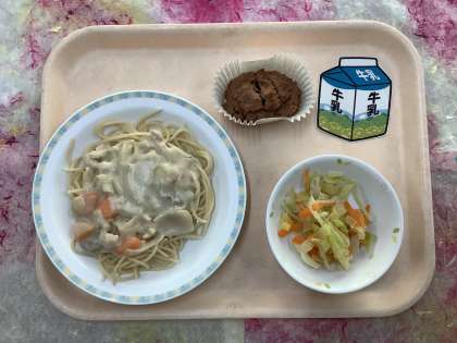 今日の主食は麺料理のスパゲッティです。前回、スパゲッティクリームソースの日に休んでしまったので、また給食で出してほしいと言われていた隠れた人気献立です。学級閉鎖のクラスが増えてきました。インフルエンザに負けないよう元気に過ごしましょう。