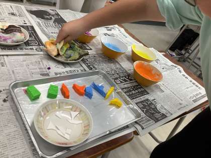 まずは、スポンジ状の材料に、絵の具を染み込ませます。