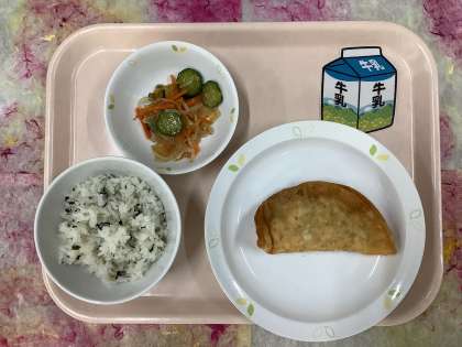 今日は6年生からのリクエスト給食「ジャンボぎょうざ」です。ジャンボぎょうざも毎年大人気で必ず上位にランクインします。給食室で一つずつ手作りして、大きな回転釜で揚げました。美味しく出来上がったので残さず食べてくれたら嬉しいです。わかめごはんも人気なので今日は残菜が少ないのでは、と期待しています。