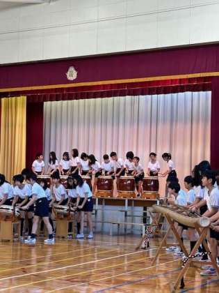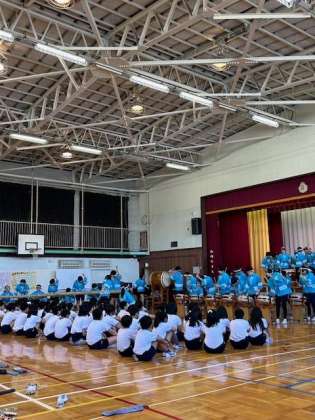 まず、5年生が「祝いの太鼓」を叩きます。師匠になって教えた6年生も熱い眼差しで見つめる中5年生は立派に叩き上げました。