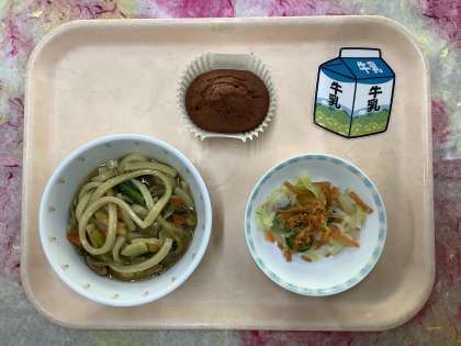 今日は隠れた人気のパリパリサラダです。カレーうどんも回転釜いっぱいに出来上がりました。今日は人気の献立なので食品ロス削減に貢献できるのではないかと思います。